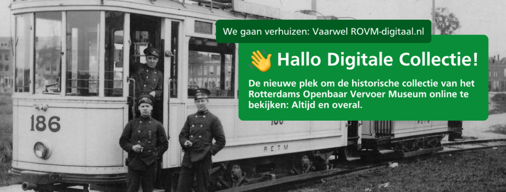 We zijn namelijk bezig om onze volledige digitale collectie over te zetten naar rovm.nl/digitale-collectie. Daar vind je nu al onze OV-verhalen; dat zijn redactionele stukken over verschillende thema’s uit de geschiedenis van het Rotterdamse openbaar vervoer. Daarnaast is daar ook de digitale kennisbank te vinden. De opzet is anders dan je hier gewend bent, en we nodigen je uit om alvast een kijkje te nemen zodat je goed weet waar je straks alles kunt vinden.